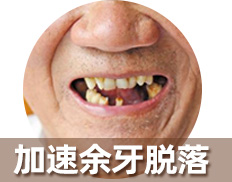 牙周组织逐渐被破坏,牙槽骨被吸收、牙齿松动,造成多颗脱落或因无保留价值拔出。